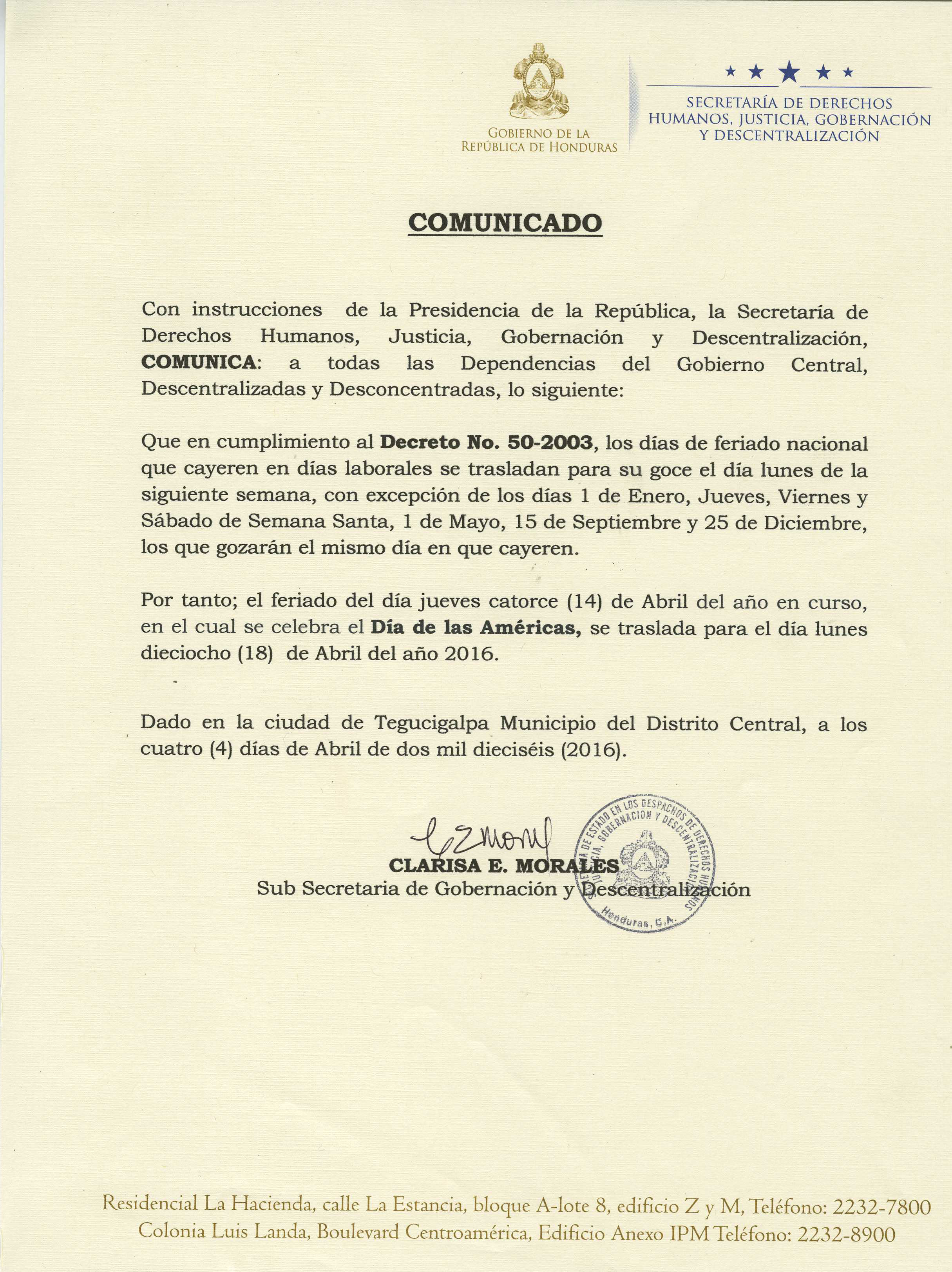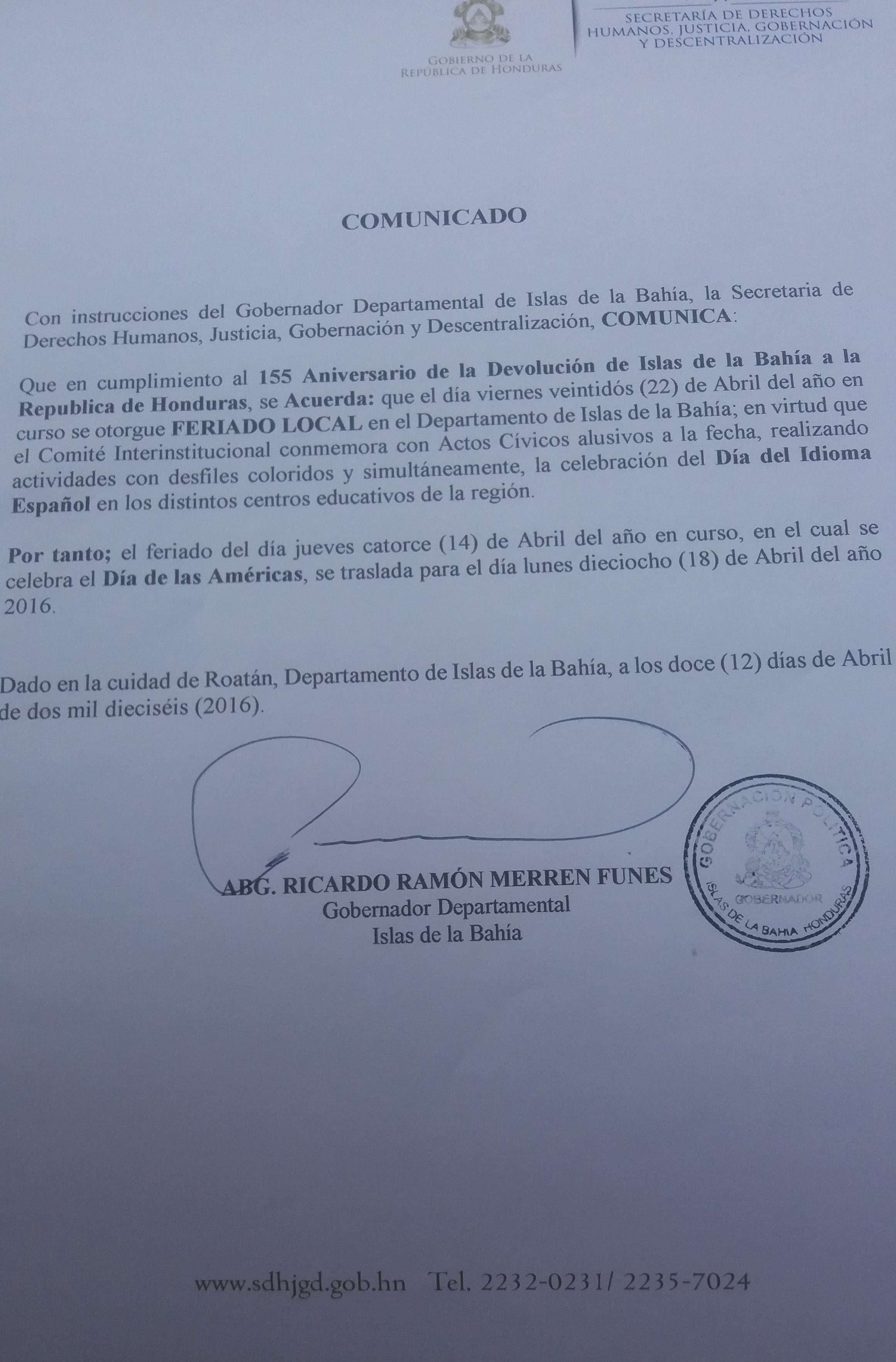 El feriado del 14 de abril, en celebración del Día de las Américas, se traslada al lunes 18 de abril. Asimismo, el gobernador de Islas de la Bahía otorgó feriado local el 22 de abril en celebración del 155 Aniversario de la Devolución de Islas de la Bahía.