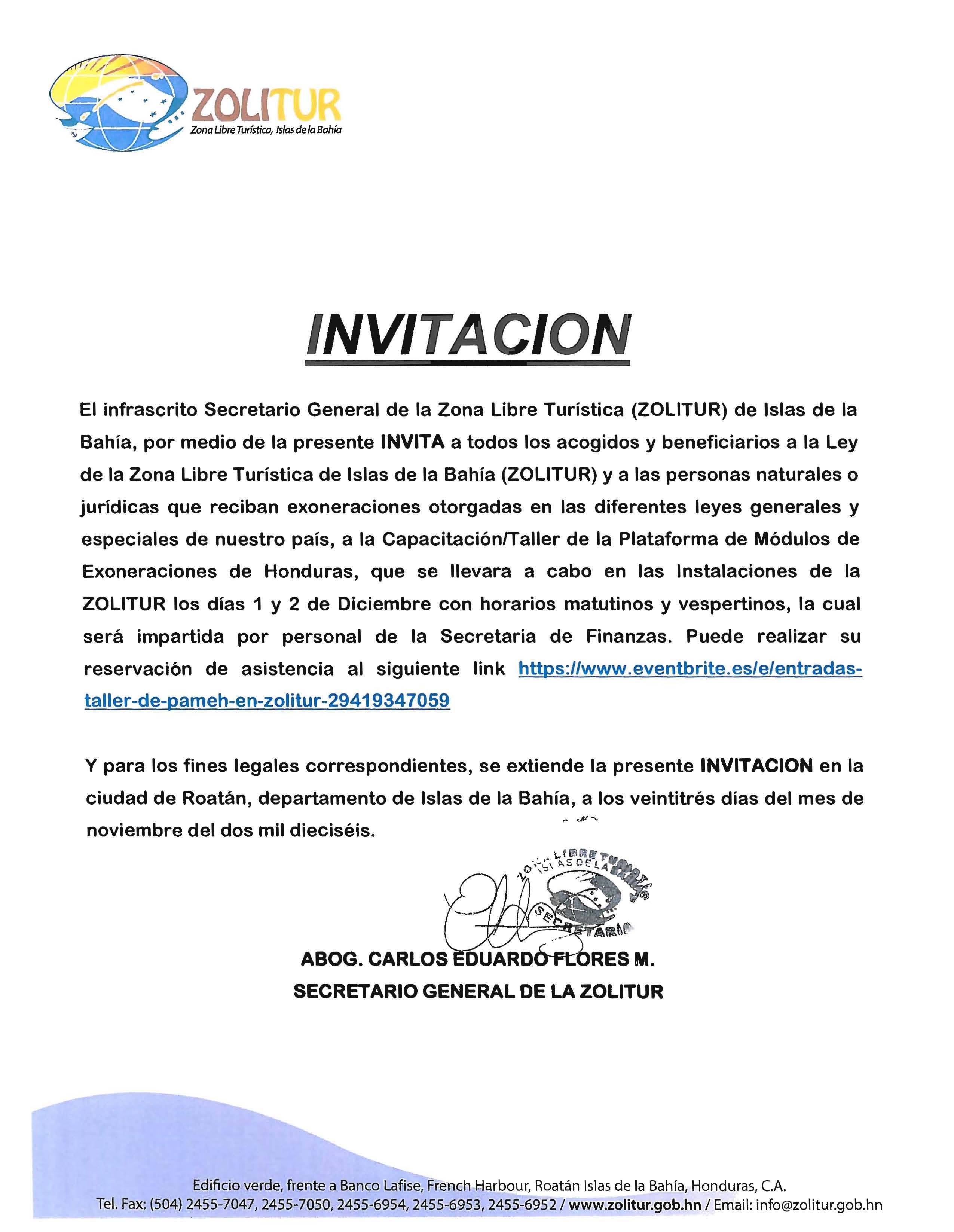 EI infrascrito Secretario General de la Zona Libre Turistica (ZOLITUR) de Islas de la Bahia, por medio de la presente INVITA a todos los acogidos y beneficiarios a la ley de la Zona Libre Turistica de Islas de la Bahia (ZOLITUR) y a las personas naturales 0 juridicas que reciban exoneraciones otorgadas en las diferentes leyes generales y especiales de nuestro pais, a la CapacitacionlTalier de la Plataforma de Modulos de Exoneraciones de Honduras, que se lIevara a cabo en las Instalaciones de la ZOLITUR los dias 1 y 2 de Diciembre con horarios matutinos y vespertinos, la cual será impartida por personal de la Secretaria de Finanzas. Puede realizar su reservacion de asistencia al siguiente link https:/Iwww.eventbrite.es/e/entradastaller-de-pameh-en-zolitur-29419347059