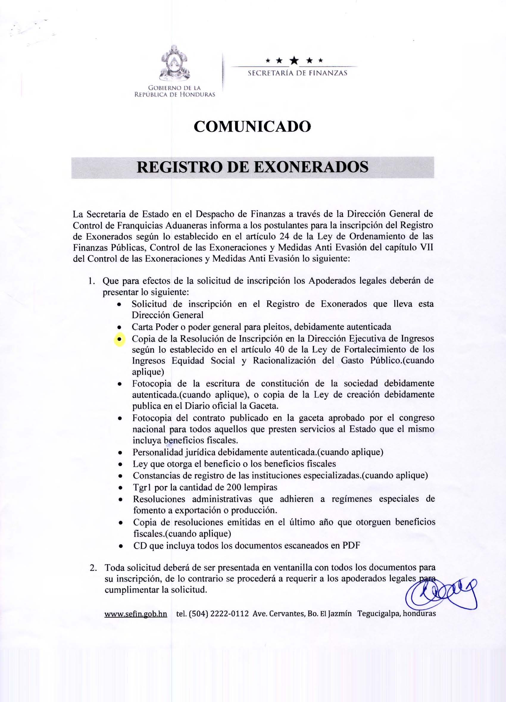 La Secretaria de Estado en el Despacho de Finanzas a través de la Dirección General de Control de Franquicias Aduaneras informa a los postulantes para la inscripción del Registro de Exonerados según lo establecido en el artículo 24 de la Ley de Ordenamiento de las Finanzas Públicas, Control de las Exoneraciones y Medidas Anti Evasión del capítulo VII del Control de las Exoneraciones y Medidas Anti Evasión lo siguiente: