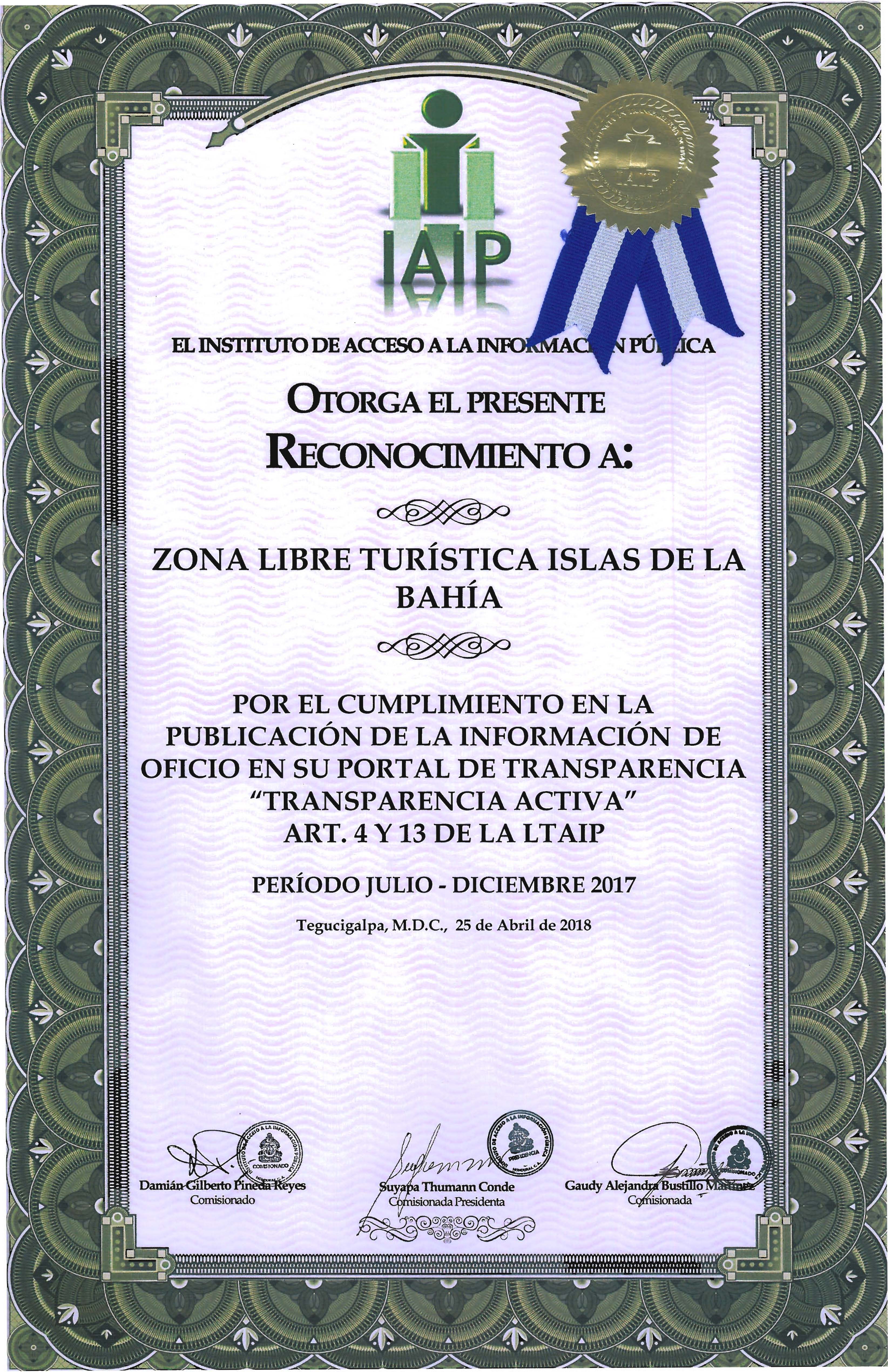 La ZOLITUR recibe por cuarta vez consecutiva reconocimiento por parte del IAIP por haber obtenido una calificación de 100% durante el segundo semestre del 2017. Al obtener este reconocimiento implica que la ZOLITUR cargó al Portal Único de Transparencia todos los documentos en tiempo y forma cumpliendo con todos los lineamientos solicitados por el IAIP. Durante el evento se dio a conocer que de las 206 instituciones evaluadas solamente 102 obtuvieron un 100%.